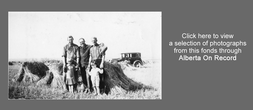 Originally ten photographs were donated to South Peace Regional Archives by Kay and Mae Trelle in 2006 for inclusion in a display about the Wheat Kings at the Grande Prairie Museum. The personal papers and the bulk of the family photographs were deposited by Kay and Mae Trelle in 2011.