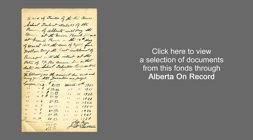 The fonds consists of documents relating to the operation of Two Rivers School District 3497. Included in this collection are executive records, assessment and taxation books, and financial records, as well as student censuses and daily registers. Also included are documents relating to personnel, curriculum, and school activities; supplies and operations; and files of correspondence between Two Rivers School District and the Grande Prairie School Division, the Department of Education and the Department of Municipal Affairs. Printed matter includes the 1937 School Act, Financial Statements from Grande Prairie School Division 14, and issues of the Alberta School Trustee.