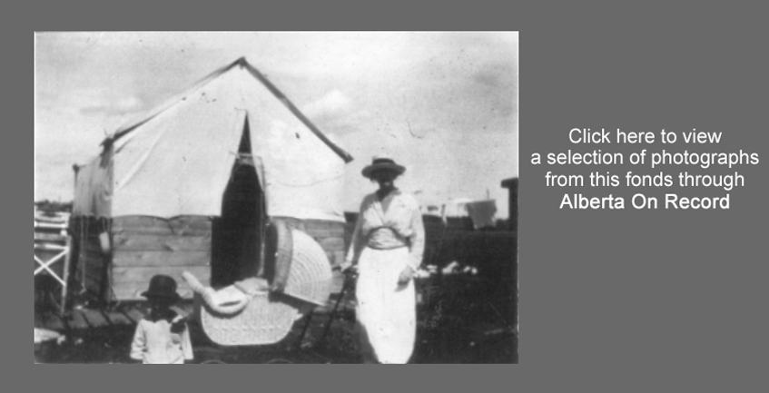 Joseph Thomas Smith, known as Joseph Digby Smith in Canada, was born in 1892 in Warrington, Lancashire, UK. In 1913 he emigrated to Canada, probably arriving in Quebec. He worked in a bank until the First World War. On September 24, 1914 he became part of the Canadian Expeditionary Force, in the 3rd Brigade Canadian Field Artillery, eventually being promoted to Captain. He fought at Ypres, the Somme, and Passchendaele. He met his future wife, Dorothy Margaret Rooke, from Birmingham, UK, during a training period or on leave, and they were married in Birmingham in April, 1916. Joseph survived the war and his son, James Andrew Digby Smith, was born in May 1918, in Birmingham. Digby was demobilized in 1919 and sailed for Canada on a troop ship June 12, 1919. For a short time he worked at a bank in St. Catherine’s, Ontario, then was posted to the Imperial Bank of Canada in Grande Prairie. The photographs reveal that they lived in a sort of caboose and Dorothy likely found the life very hard as she was unhappy there. A daughter, Lucy, was born June 20, 1920, in Grande Prairie. Digby suffered from depression after the traumas of the war and was away from home often which put the marriage under great strain. He requested a transfer and they moved to Ruddell near North Battleford, Saskatchewan. However, the marriage broke up in 1922. Digby went south to the USA and Dorothy returned to the UK with the children. Dorothy remarried and Digby, when he retired, returned to Canada and died in Brentwood Bay on Vancouver Island in 1973. Their son, James, who was the donor’s father, remembers his father talking to him about their life in Grande Prairie.
