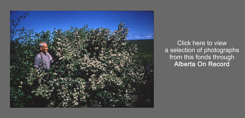 The file consists of 261 slides dating from 1954 to 1988 from a variety of locations including the Beaverlodge Experimental Station and the Beaverlodge Nursery. There are slides of chokecherry, bird cherry, buffalo berry, pincherry, gooseberry, raspberry, blueberry, plums, currants, cranberry, dogwood, cotoneaster, aronia, hawthorn, maple, basswood, elm, ash, barberry, caragana, Ohio buckeye, poplar, saskatoon, mountain ash, oak, birch, and roses, including slides of some of John Wallace’s cultivars: the Copper Schubert chokecherry, the Green Island cranberry, and the Altaglow saskatoon. The slides have been numbered according to their original order within the binder labelled “Saskatoon, Chokecherry, Pincherry, Current, Cranberry, Dogwood, Hawthorn, Mnt. Ash, Willow, Pine, Poplar, Maple, Elm, Bur Oak, Larch, Green Ash”, but blank spaces originally between some slides have been removed. |